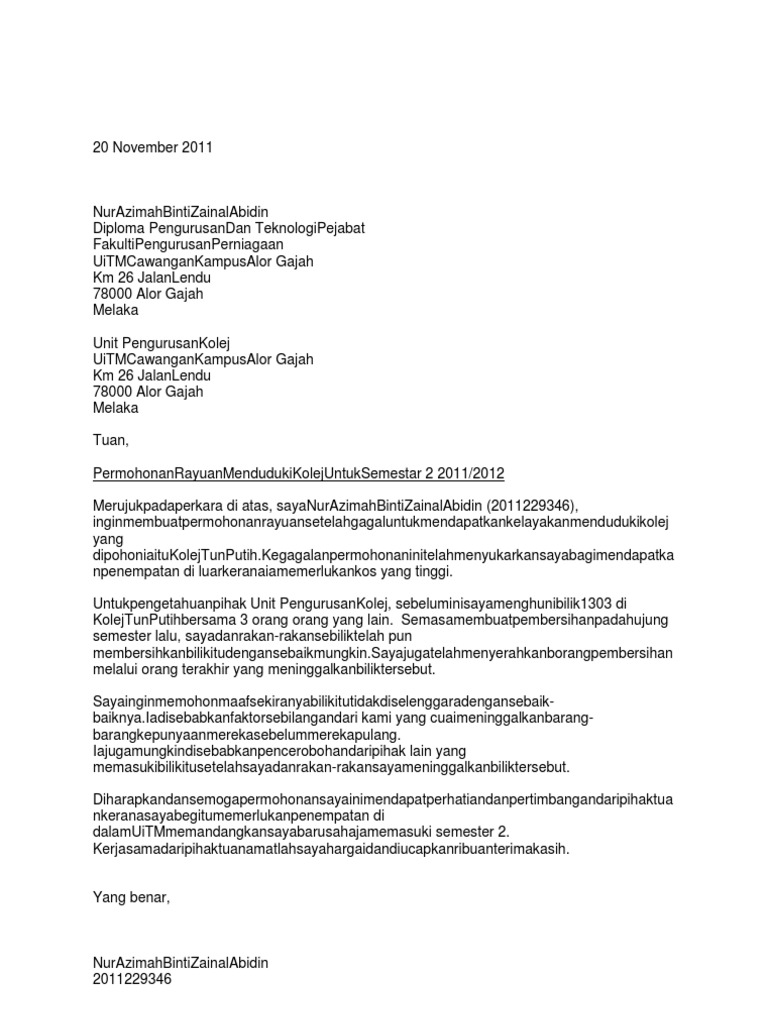 Contoh surat rayuan menduduki kolej kediaman uitm contoh.